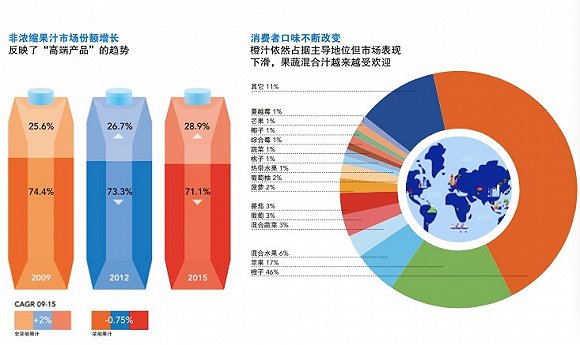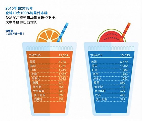 (注:上文所说的“100%纯果汁”指全部以水果为原料制成的果汁产品,含有源自水果的天然成分,包括果汁或浓缩果汁、 水、天然香料以及果肉等,总体分为浓缩果汁和非浓缩还原果汁两类)