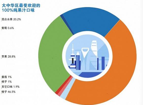 在大中华区,100%纯果汁产品主要通过现代零售渠道销售,而且在发达地区大城市的市场渗透率更高,单在北京、江苏和上海三地的销量就占到全国100%纯果汁产品总销量的45%。