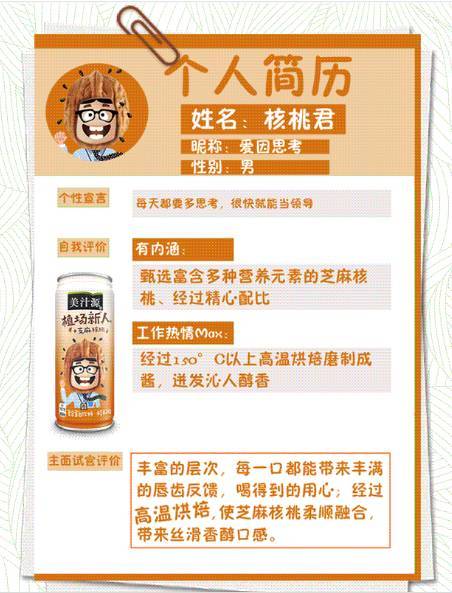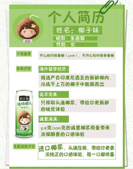 “植场新人“的名字直白地宣示了这款饮料的目标受众, 18-26 岁,刚进入职场的年轻人。美汁源还为产品做了一张面试表,记载着产品品牌形象的姓名、性别、自我评价和主面试官评价。比如椰汁的品牌形象“椰子妹”的简历就显示,她有印度尼西亚留学经历,自我评价“追求完美“,”诚意满满”。