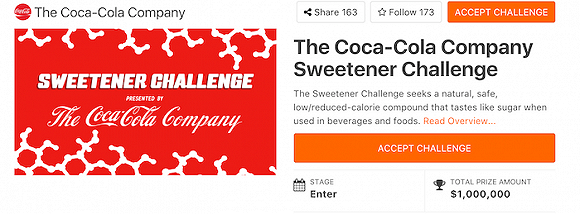 其中一个项目叫“甜味剂挑战(Sweetener Challenge)”。这个众筹更为专业,要求参与者有科学研究背景。提交文档则需要包含化学式和完整的测试过程,比如光照、酸碱度。到2018年10月,可口可乐会奖励最终获得第一名的项目100万美元。