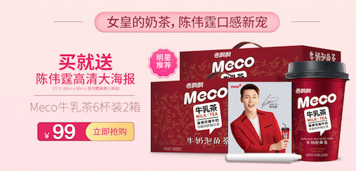 今年6月,香飘飘已经推出了定位高端奶茶市场的杯装即饮奶茶——Meco牛乳茶。目前,在天猫香飘飘食品旗舰店里,6杯300ml装Meco牛乳茶的优惠价为49.9元。为了吸引年轻人,这个老品牌为新品找来陈伟霆做代言,并在手机端玩起了增强现实(AR)互动。