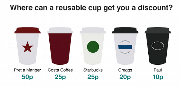 如果消费者自带杯子的话,买咖啡可以优惠25便士。英国几乎所有的大型连锁咖啡品牌也在尝试类似的优惠,Costa、Pret a Manger、Greggs等门店皆是如此。