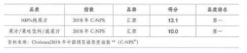 在1月10日举行的2018(第四届)中国顾客推荐度指数(C-NPS)研究成果新闻发布会上,国家TOP品牌汇源赢得开年“第一奖”,分获100%纯果汁和果汁/果味饮料/蔬菜汁两大品类中国顾客推荐度指数(C-NPS)排名第一位,成为行业中“顾客最推荐品牌”,领衔行业口碑榜。