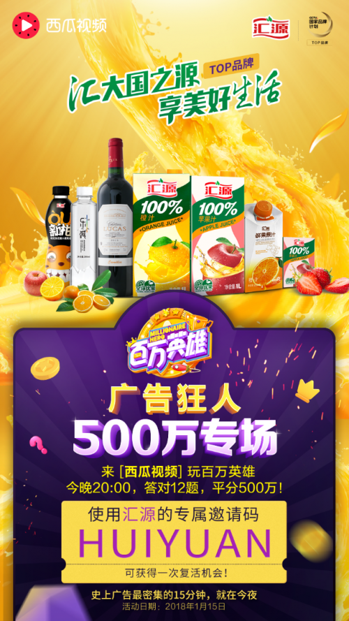1月15日晚8点,《百万英雄》举办“广告狂人”专场,单场奖金500万元,共吸引510万人参与,创造了答题互动的游戏记录。在这场“创纪录”的直播答题中,汇源作为品牌合作伙伴,通过“品牌海报邀请码”、“品牌植入题目”、“主持人口播”等方式,融入到节目之中,与网友进行趣味互动,并传递品牌信息。