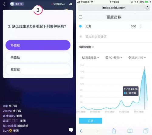 1月15日上午,西瓜视频发布带有汇源专属邀请码的品牌海报,为晚间的“广告狂人”营销专场预热造势。在晚间的直播答题环节中,汇源则将品牌巧妙植入生活常识问题“缺乏维生素C易引起以下哪种疾病”,接着由主持人陈铭口播“汇源补充维生素C,有汇源才叫过年”,在分享知识的同时实现消费者引导及品牌理念传播。