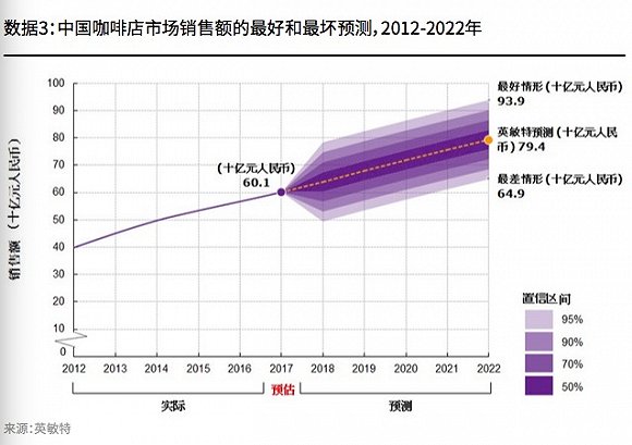 据咨询公司英敏特(MINTEL)预测,2017-2022年间,中国咖啡店市场的销售额将以5.7%的年均复合增长率增长,到2022年将达到794亿元,咖啡店的门店数量预计将达到8万家。