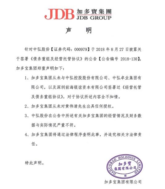 但这份协议公告发布后不久,加多宝就在8月28日上午发布了否认公告,称从未与中弘股份(000979.SZ)、中弘集团等签署过《经营托管及债务重组协议》,对于协议所述内容全不知情。加多宝集团在声明中还表示,从未对黄伟清出具任何授权,且中弘股份在公告中所述有关加多宝集团的经营情况及财务数据与实际情况严重不符。