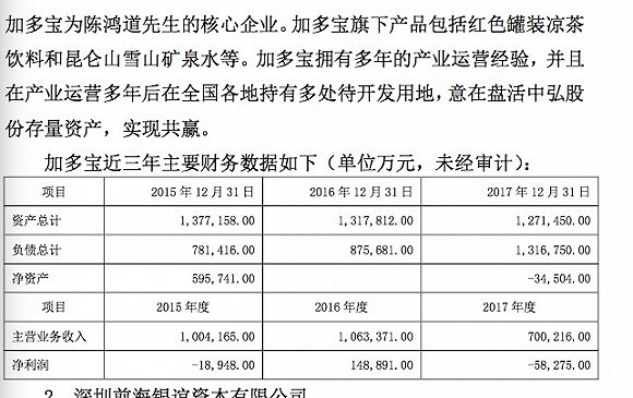 按上述公告中的协议显示,加多宝2015年-2017年未经审计的主营业务收入分别为100.4亿元、106.3亿元和70.02亿元,净利润分别为-1.89亿元、14.8亿元和-5.82亿元。2017年,加多宝的营业收入和净利润出现大幅下滑。