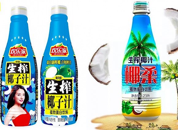 从外包装看,椰柔与另一个椰汁品牌“欢乐家”的蓝色包装颇为相似,均以蓝色调为主要色系,商品名称都突出“生榨”字样。售价方面,欢乐家在天猫旗舰店的单价为13.3元(1.25L),而超市中常见的“台椰”牌则是15.5元(1.25L),椰柔的定价与市场均价相符。