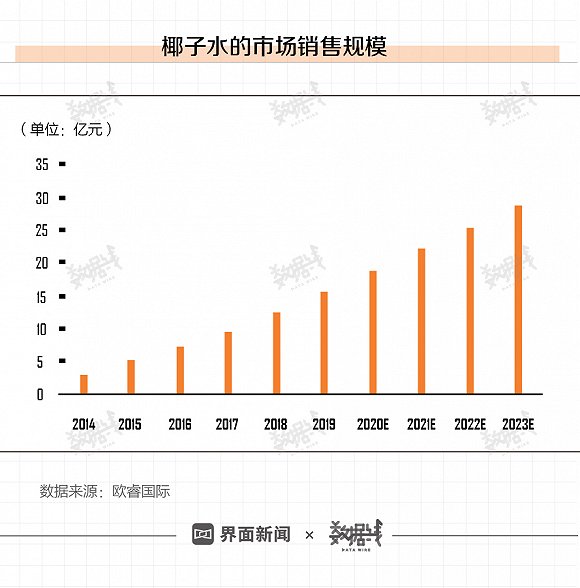 咨询公司欧睿国际(Euromonitor)向界面新闻提供的数据显示,2014-2018的5年间,椰子水类目产品的零售额从2.96亿元增长至12.48亿元。从销售额趋势看,这一品类未来5年仍然以较快的速度增长。2019年预计这一品类增长至15.48亿元,至2023年可达28.7亿元。椰子水市场前3大品牌分别为UFC(26.9%)、Vita Coco(23.7%)、Koh(酷椰屿,11.5%)。