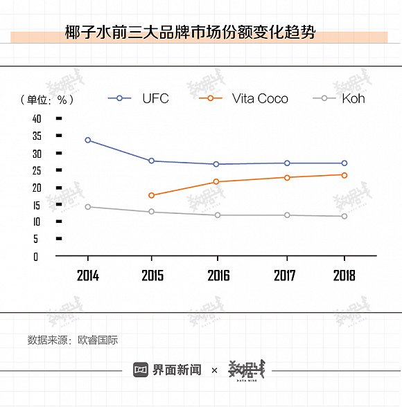 欧睿国际的数据显示,Vita Coco的市场占有率从2015年的17.6%增长至2018年的,增长速度超过了UFC和Koh。
