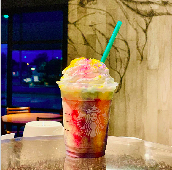今年,星巴克在北美地区上市的夏季限定星冰乐,仍然走彩色渐变风格,名为“扎染星冰乐(Tie-Dye Frappuccino)”——奶油基底上有红蓝黄相间的渐变糖粉,像是彩虹扎染的颜色。有星巴克员工透露,这款星冰乐喝起来像香蕉味的Laffy Taffy水果软糖。新款星冰乐仍然限时售卖5天,从7月10日开始发售。