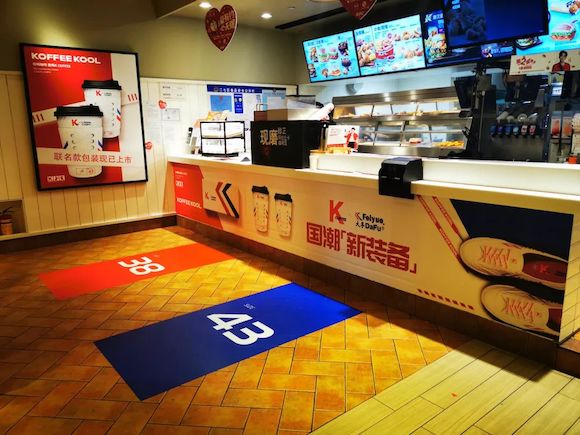为吸引消费者进店,肯德基最近还跟国产运动潮牌大孚飞跃合作,推出了肯德基x大孚飞跃主题店,并以球鞋尺码替代咖啡杯型(38码为中杯、43码为大杯)。肯德基微信公众号显示,它将在全国范围内开出22家该主题门店。