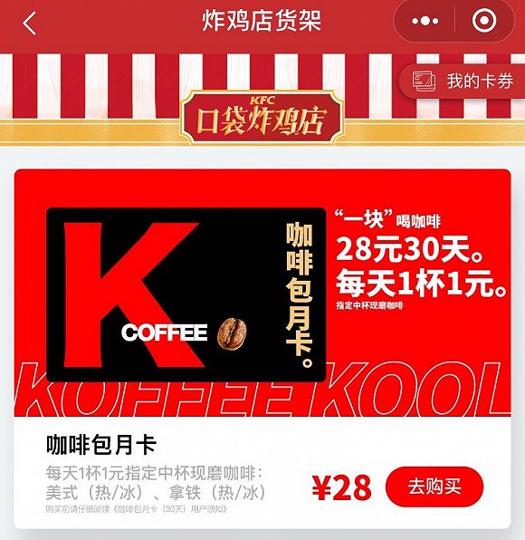 该月卡售价28元,消费者只能通过“肯德基口袋炸鸡店”小程序购买。购买激活后的连续30天内,每天会得到1杯中杯现磨咖啡,包括拿铁咖啡和美式咖啡两种。