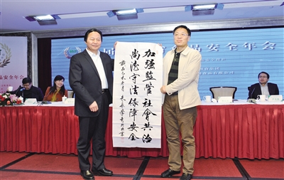 湖南省食品药品监管局副局长吴公平(右)代表省局接受中国食品安全报社社长兼总编辑朱长学(左)赠送的“加强监管 社会共治 尚德守法 保障安全”书法作品。