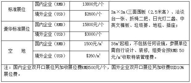 标准展位 国内企业(RMB) 13800元/个 3m×3m(三面围板(2.5米高)、洽谈台一张、折椅二把、日光灯二盏、中英文楣板、垃圾篓、地毯、插座; 境外企业(USD) $2600/个