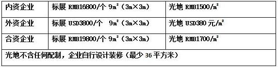 9㎡标准展位收费(包括:展出场地, 2.5m高壁板 一条中英文楣板、洽谈桌一张、二把椅子、220V电源插座、射灯二支、展位内满铺地毯;注:双开口展位加20%费用;)