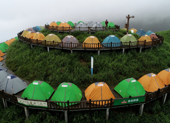 在武功山草甸星空户外营地,成百上千的帐篷多姿多彩、星罗棋布地错落于万亩草甸之中,山峦间流淌的云海如诗如画,让人如痴如醉。高山草甸、云海、帐篷,手持青岛啤酒畅饮的驴友点缀其中,恍若置身梦境之中。