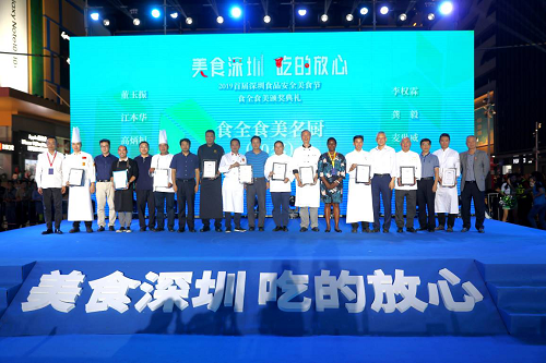 闭幕式上,美食节“食全食美”系列奖项正式揭晓,以表彰2019首届深圳食品安全美食节活动中表现优异的商家和个人。其中,深圳福田香格里拉大酒店中餐行政总厨董玉振、佳宁娜集团粤菜名师江本华等10人获评食全食美名厨,潮江春、南粤春等10家参展商获评食全食美名店,探炉(探炉烤鱼)、五稻烧鸡(五稻有汁烧鸡)等10家名店代表食品获评食全食美名菜;西贝(莜面蒸饺)、蔡澜港式点心店(酥皮山楂叉烧包)等10款美食获评食全食美名面点,来自“圳品”商家乐颐和甘肃武威等企业和地方的10款食材获评食全食美名食材。