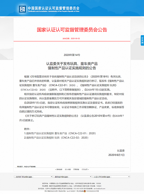 公告同时发布了《强制性产品认证实施规则 童车类产品》(CNCA-C22-01:2020)、《强制性产品认证实施规则 玩具》(CNCA-C22-02:2020)。新版规则自2020年7月1日起实施。