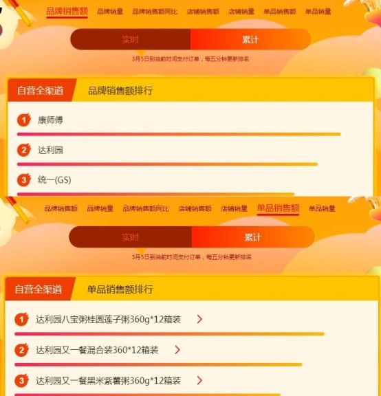 从活动期间的综合销售成绩来看,康师傅品牌销售额*多,这也并不奇怪,康师傅各种口味方便面的身影几乎无数不在。达利园位居第二,依靠口感出色的粥占据市场领 先地位。统一位列第三,与康师傅的距离进一步拉近。从单品销售累计榜单来看,销售额* 高的前三位都是达利园的产品,康师傅单品没有上榜可能和其较低的价格有关,康师傅明显是薄利多销专注走量。