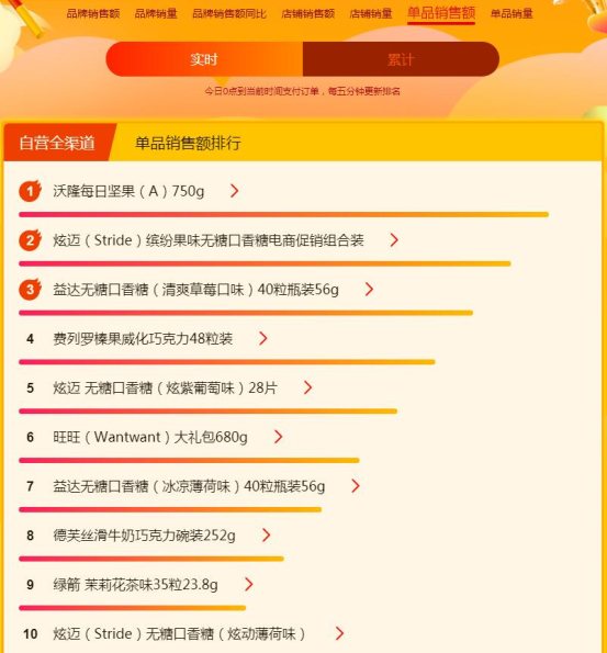 零食是人们现代生活不可缺少的调味剂,虽不能当主食吃但休闲时刻磨磨牙带来的享受总是美妙的。从今日的单品销售额排行榜来看,沃隆坚果*为火爆,炫迈口香糖呈爆发式增长位居第二,益达无糖口香糖探花。