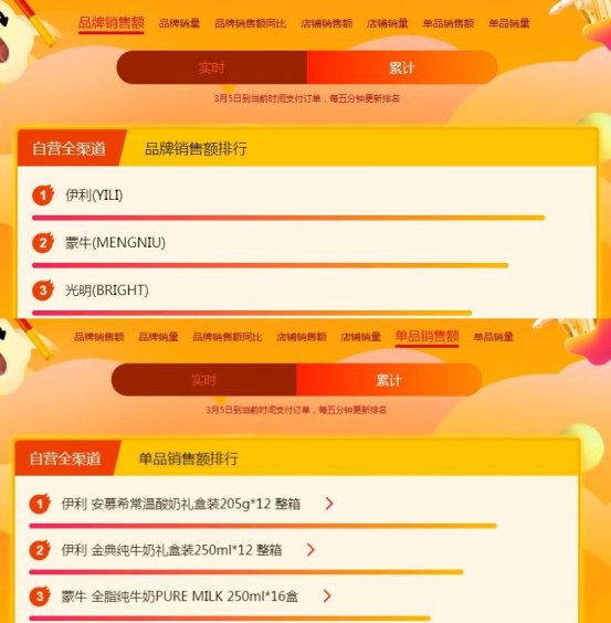 如今国人对于自身营养的摄入已经越发重视了,因此乳制品变得渐渐畅销起来。乳制品中不仅包含了纯奶类,味道各异的酸奶也成了少男少女不可不尝的风味。看一下今日的单品销售榜单我们发现,伊利占据了前三的位置,金典纯牛奶、安慕希常温酸奶与高钙低脂奶*为热销,其余席位蒙牛占据大多数。