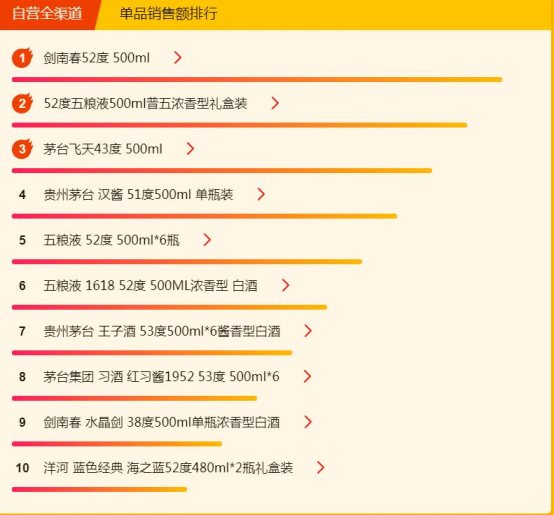 俗话说无酒不欢,白酒是酒中*受欢 迎的品类之一,对于许多消费者来说白酒的口感与价格都是值得关注的重点。截止到3月17日上午十一点,白酒类单品销售额排行榜显示,剑南春52度白酒是当下* 受欢迎的产品之一,此外52度五粮液与43度茅台飞天位居二三位。通过单品前十榜单来看五粮液与茅台占据了大多数席位,看来大众对于高端酒喜爱有加,好酒品质有保证不在意多花一点银子。