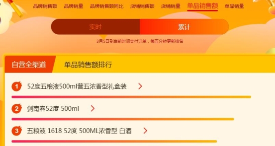 从3月5日到当前总体销量统计来看,在315全面焕新节期间卖的*为畅销的为52度五粮液500ml普五浓香型白酒,剑南春单品强势占据销量第二的位置,第三依然为五粮液品牌。可见,五粮液在市场表现十分亮眼,* 受消费者欢迎。