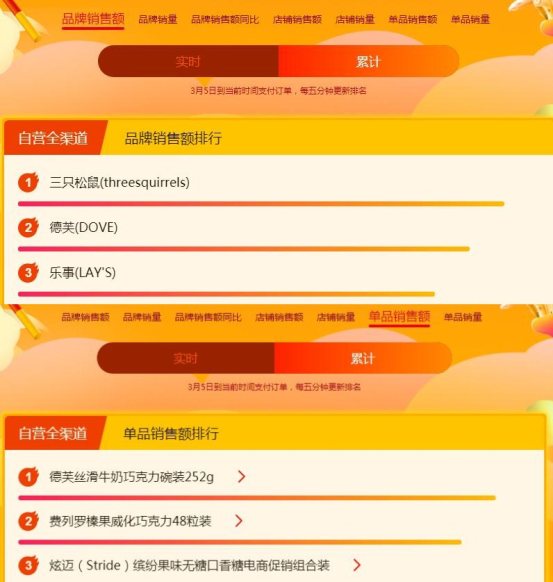 从活动期间累计的单品销售额来看,德芙丝滑牛奶巧克力成为*受零食爱好者喜爱的单品,费列罗榛果威化巧克力与炫迈无糖口香糖位居次席。需要注意的是,销售业绩*好的为坚果大王三只松鼠,德芙成为巧克力市场一哥,乐事成为具竞争力零食品牌第三名。